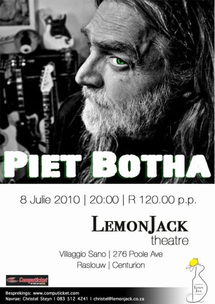Piet Botha has started writing songs for a new Afrikaans album to be released in the new year. Botha’s last Afrikaans album was the SA Rock Digest album of the year for 2003, Die Mamba. For the past seven years, Botha has focussed on the Jack Hammer band releasing two highly-acclaimed albums, The Pilgrim andContinue reading “New Afrikaans album coming from Piet Botha in 2011”